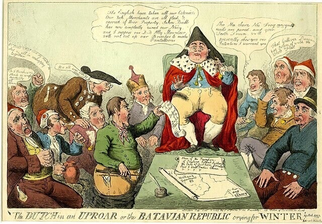 Dutchmen (three-quarter length) sit on both sides of a narrow council table, on one end of which sits, full-face, a Dutchman in a chair of state. He smokes a pipe, wears a hat, and an ermine-trimmed robe over his clumsy jacket and breeches. A post-boy, whip in hand, stands by the table (left) holding out a scroll: 'Account of the Total Defeat of the Dutch Fleet.' The news is received with expressions of rage and horror. The president, whose words issue in a cloud of tobacco-smoke, says: "The English have taken all our Colonies; Our rich Merchants are all fled & carried of thier Property; John Bull has now compleatly ruined our Navy and I suppose our D-----d Ally Mounseer will next cut up our Breeches to make Pantalloons" [cf. BMSat 8613]. A man in the foreground (left), a bottle of 'Gin' projecting from his pocket, bawls, "Oh Dear what can the matter be Let us all be unhappy together". An elderly man leans forward to read the bad news, saying, "It is all over with us now". A man behind him clenches his fist furiously, shouting "So I think, you stink so confoundedly sit down". A man on the right, clutching his head, says: "That Gulliver Duncan has Swam of with the Whole Fleet." A Frenchman sitting inconspicuously behind the President's chair takes a pinch of snuff, saying: "Aha Ma chere Nic Frog now your nails are pared and your Teeth Drawn We'll presently shew you our Intentions I warrant you." He is probably Noel, the French Minister at the Hague. On the table is a large map of an extended France on which is marked: 'Holland Department 85.' With this is a 'Plan of the Invasions of England Ireland Scotland the Cape of Good hope Gibralter East & Wes